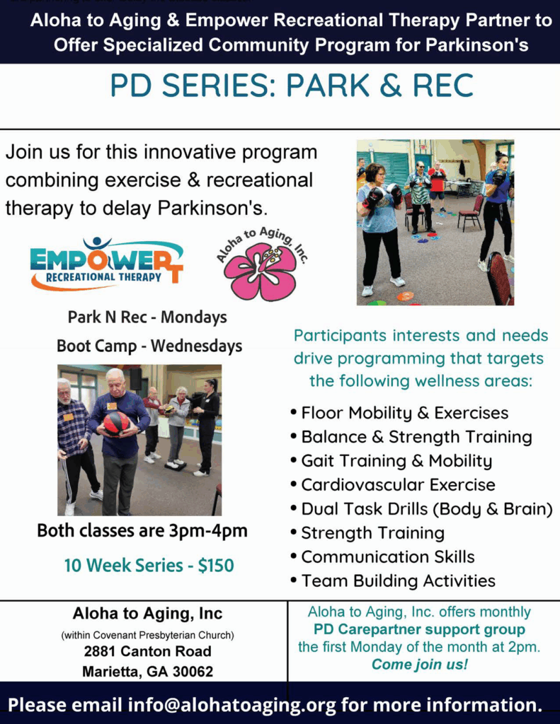 For individuals living with Parkinson’s Disease, this 10-week program addresses both motor and non-motor symptoms of PD, including mobility, posture, balance, strength, anxiety, depression, speech volume, etc. This program uniquely combines exercise and recreation-based modalities to combat PD symptoms, in which the participants have the autonomy to choose what series they are most interested in. This person-centered approach allows participants to select from a variety of therapeutic exercises and activities, such as, yoga, tai chi, adaptive sport, expressive therapies, art, dance, music/singing, outdoor cycling, passive/active games, and team building activities. This person-centered program is driven by the participants’ needs, interests, and goals truly putting the “fun” in functional. We offer this on Mondays at 3:00PM and the higher intensity “Boot Camp” version on Wednesdays at 3:00PM (This is an ongoing program)